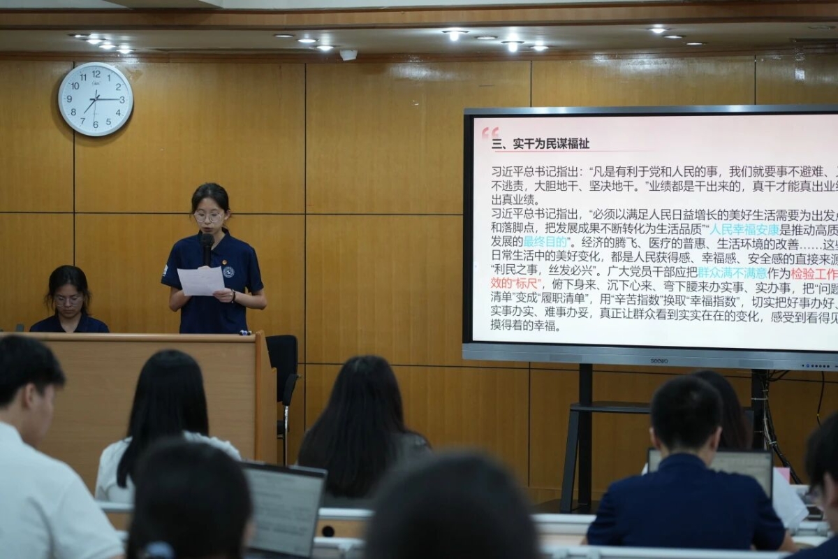 在2025年5月23日举行的“学思践悟新思想・青春建功新时代”读书分享会上,学员分组围绕《习近平与大学生朋友们》等经典著作,结合外语专业特色,就社会发展、文化建设、教育强国等议题展开深度研讨,在思想碰撞中深化理论认知。
