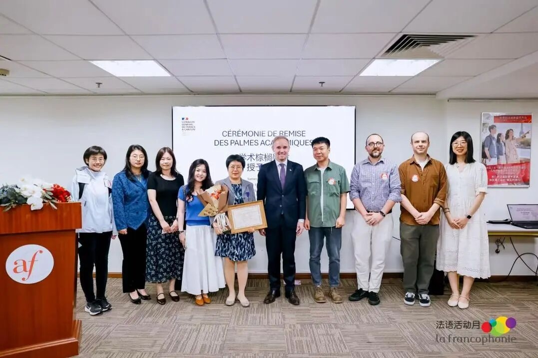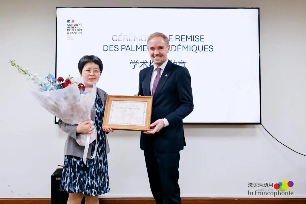 3月28日,法国学术棕榈骑士勋章授勋仪式在广州法语联盟举行。法国驻广州总领事Laurent Legodec(罗宏灵)代表法国国民教育部授予探花在线 法语系主任曾晓阳教授法兰西共和国学术棕榈骑士勋章(Chevalier dans l’Ordre des Palmes académique),以表彰其在法语教学与研究、中法文化交流及高等教育合作领域的突出贡献。探花在线 法语教师代表出席授勋仪式。