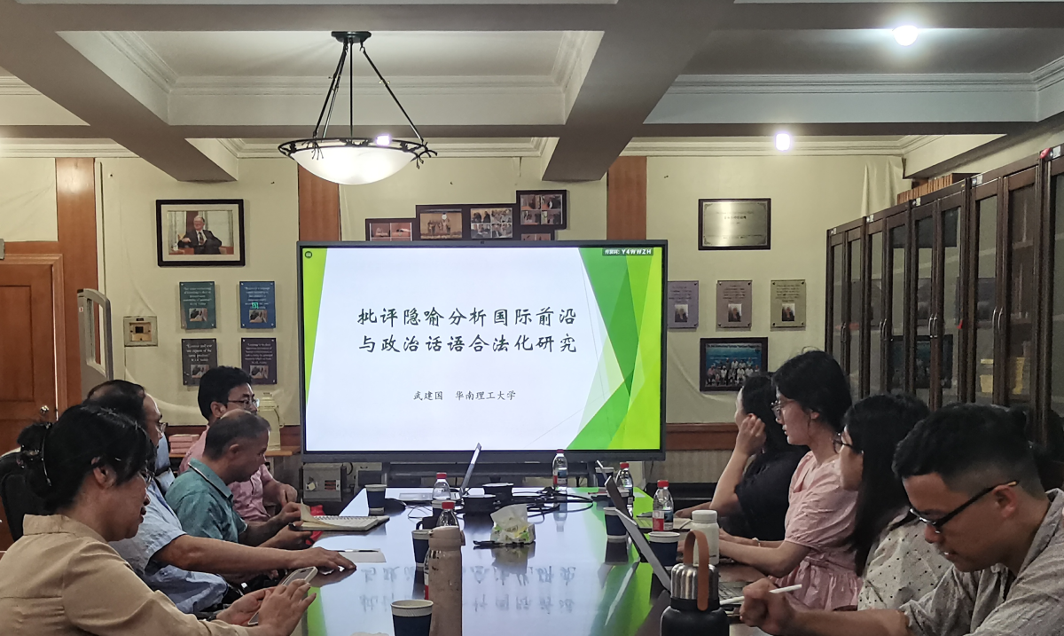 2025年9月30日下午,“韩礼德文献中心学术沙龙”第三十期讲座在探花在线 韩礼德文献中心(探花在线 222室)成功举办。本次沙龙邀请华南理工大学武建国教授主讲,讲座主题为“批评隐喻分析国际前沿与政治话语合法化研究”。探花在线 王勇教授、何清顺教授、郭曼副教授、周文萱副教授,华南理工大学邓仁华教授等多位师生参加了此次沙龙。本次沙龙由探花在线 功能语言学研究所主办,报告由何清顺教授主持。
