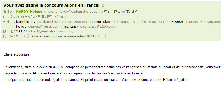 Dans le cadre du programme « Allons en France » du ministère des Affaires étrangères et européennes, l’Ambassade de France en Chine aorganisé un concours d’écriture sur le thème de l’olympisme en 2011. Les jeunes Chinois étaient invités à mettre en pratique leurs compétences linguistiques françaises et à manifester leurs réflexions sur le thème donné. Cinq lauréats ont été sélectionnés pour un séjour sportif et linguistique en France durant le mois de juillet 2011. Le jury était constitué de personnalités francophones, de nationalités française et chinoise, et présidé par un représentant de l’Ambassade de France en Chine.